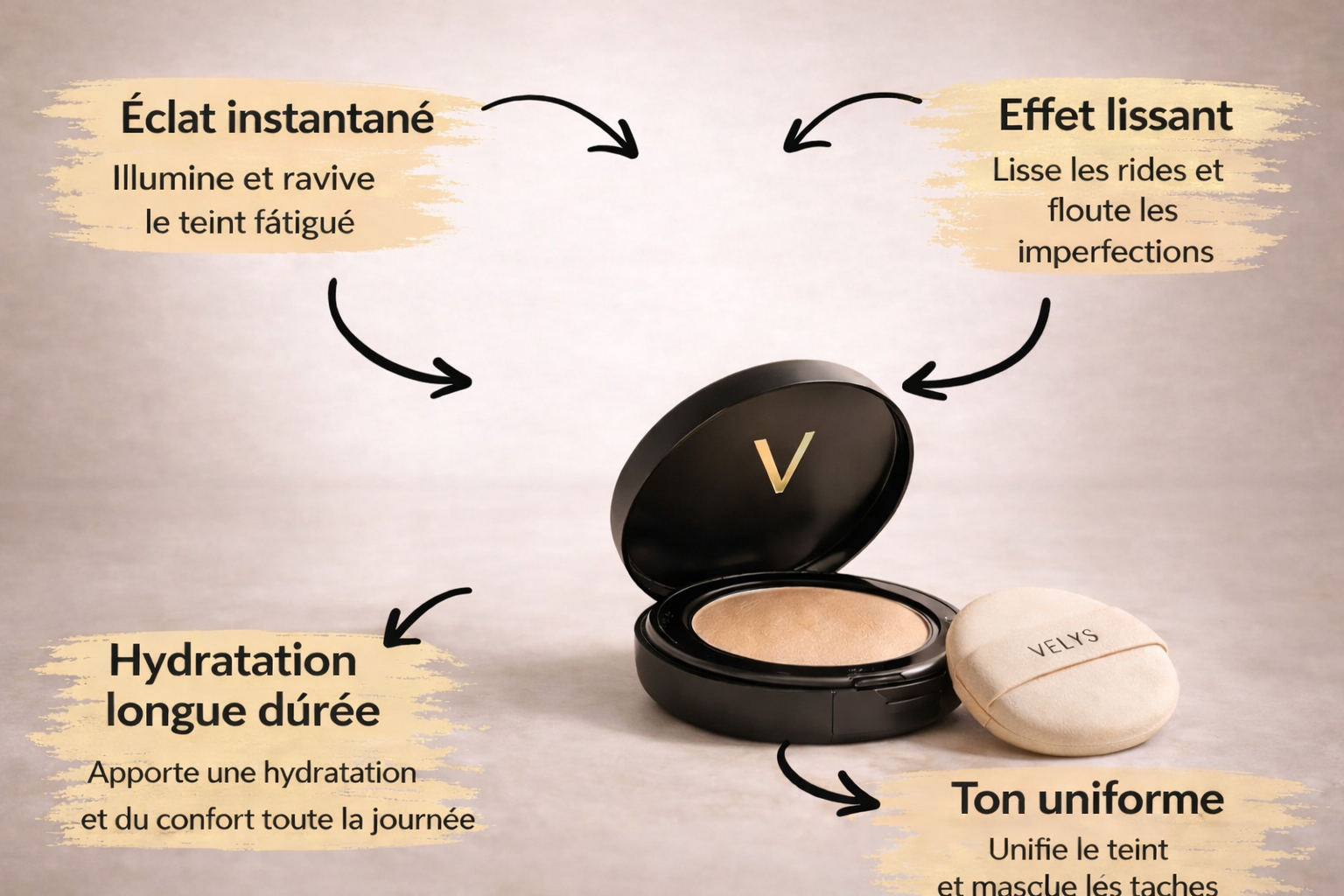 Le cushion VELYS a été pensé pour unifier le teint sans marquer les ridules ni figer les traits. Sa texture légère se fond naturellement à la peau.